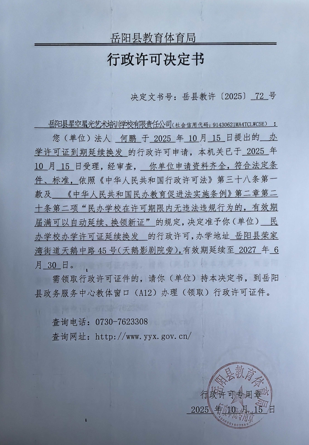 关于准予岳阳县星空星光艺术培训学校有限责任公司办学许可证到期延续换发的许可决定