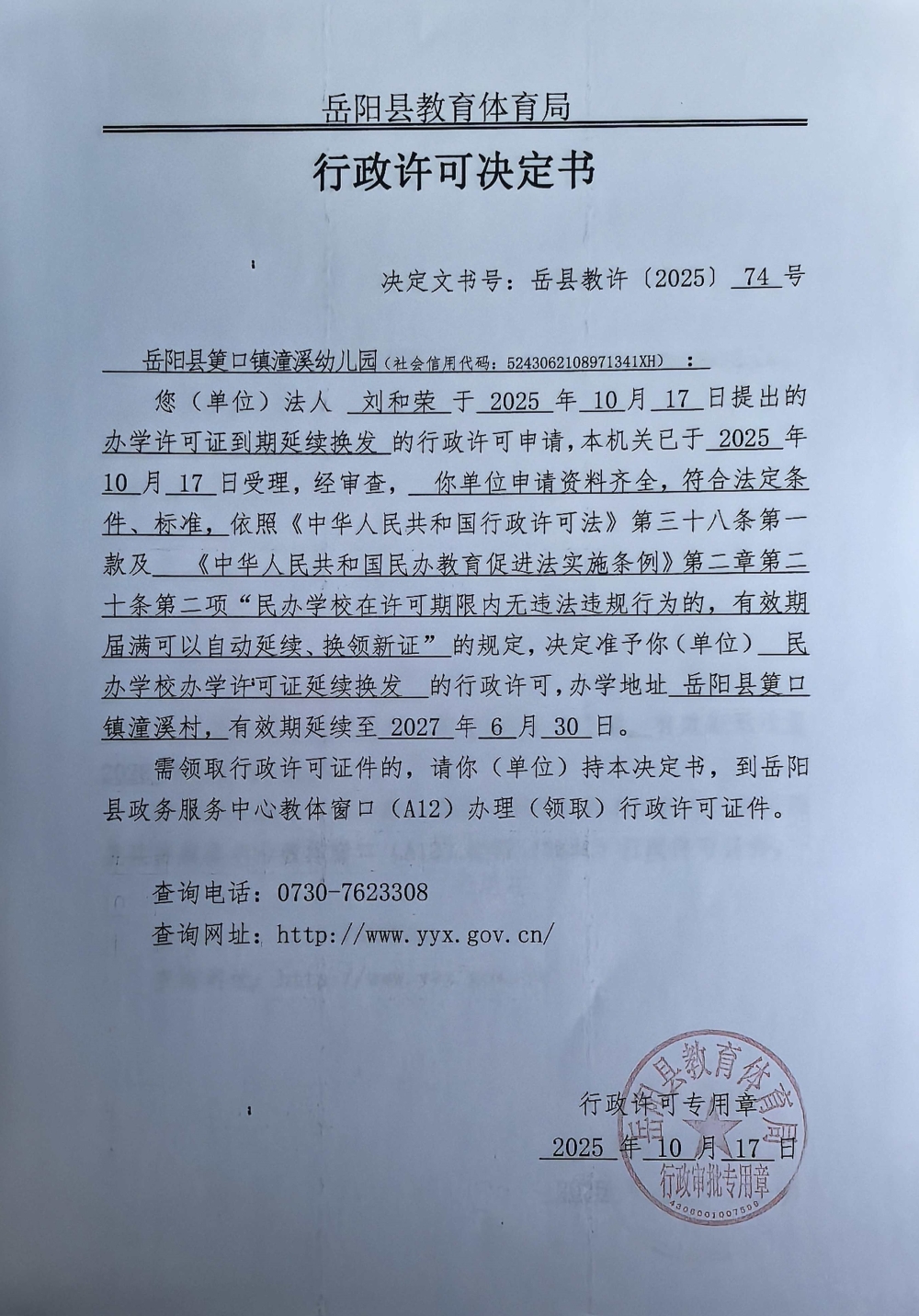 关于准予岳阳县筻口镇潼溪幼儿园2025年办学许可证到期延续换发的许可决定