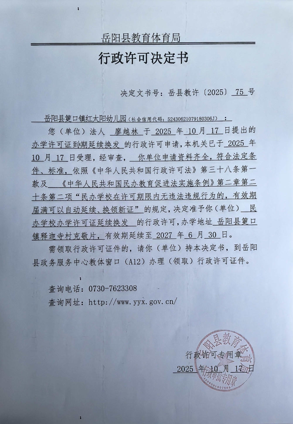 关于准予岳阳县筻口镇红太阳幼儿园2025年办学许可证到期延续换发的许可决定