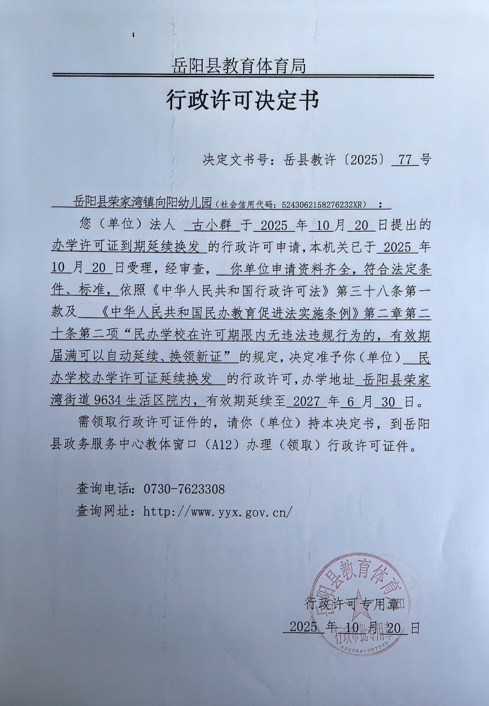 关于准予岳阳县荣家湾镇向阳幼儿园2025年办学许可证到期延续换发的许可决定
