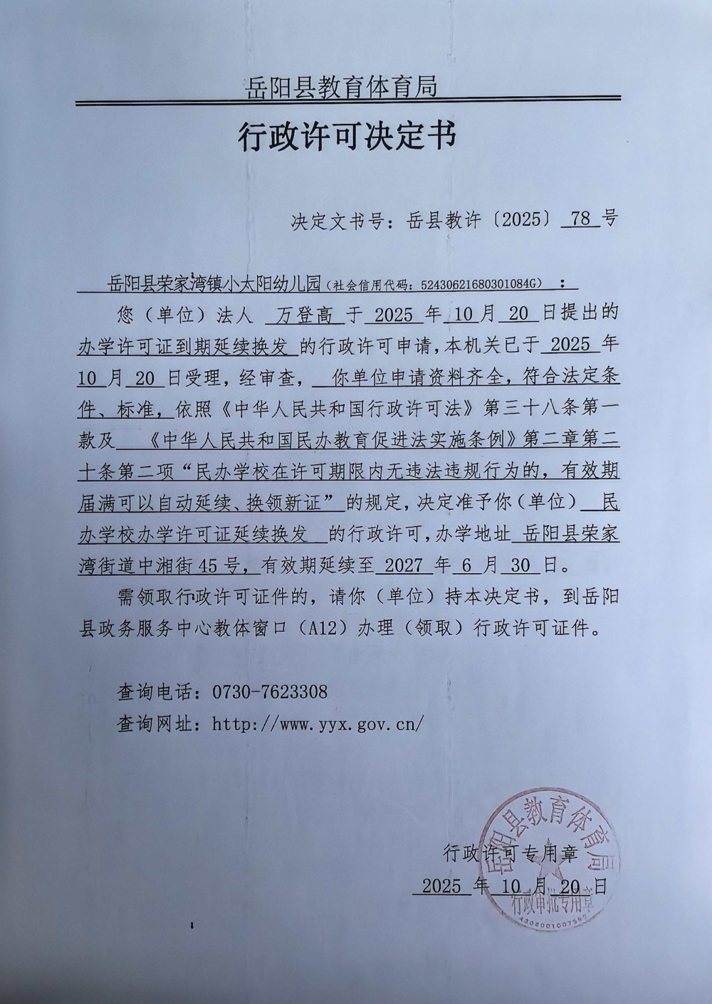 关于准予岳阳县荣家湾镇小太阳幼儿园2025年办学许可证到期延续换发的许可决定
