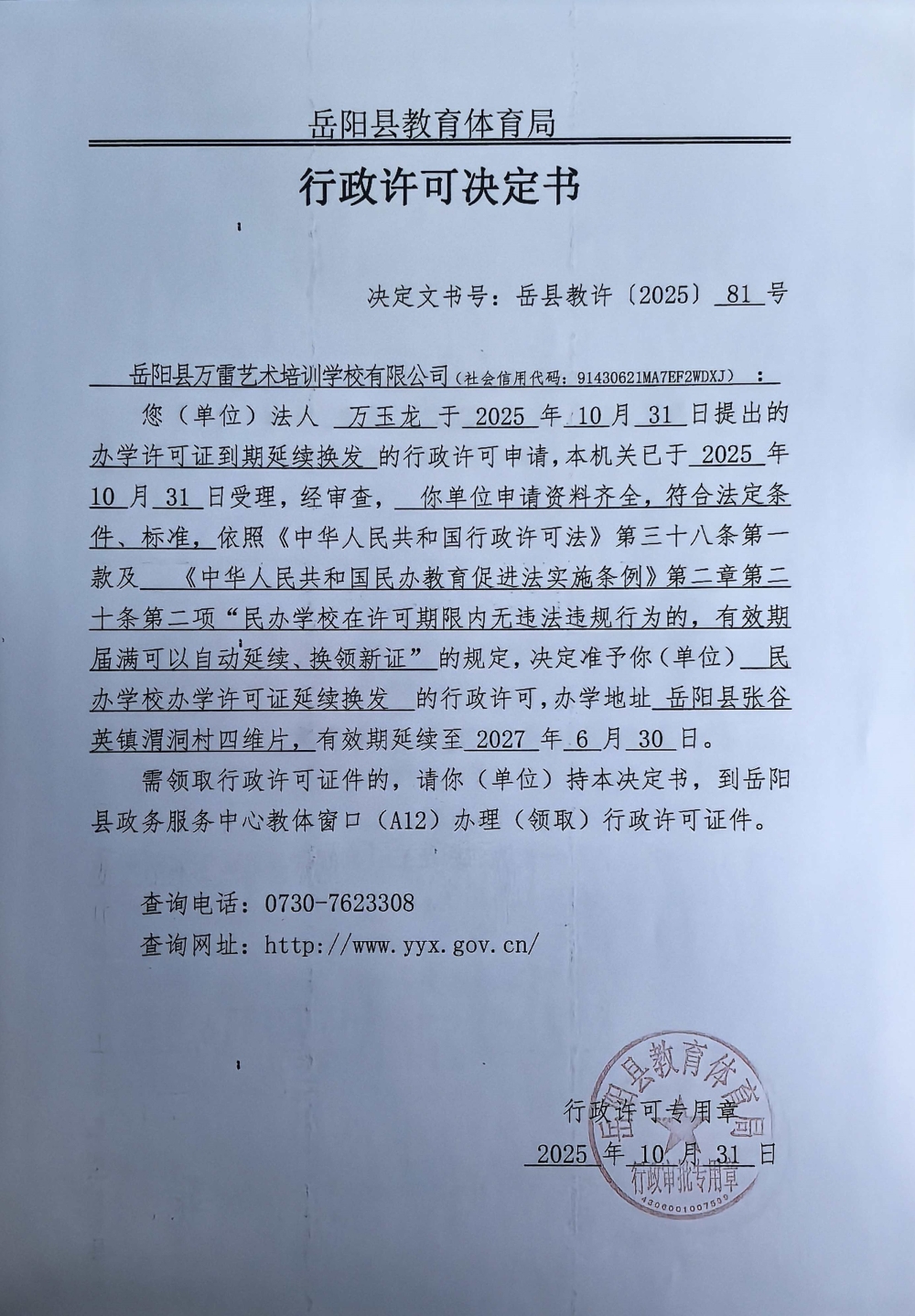 关于准予岳阳县万雷艺术培训学校有限公司办学许可证到期延续换发的许可决定