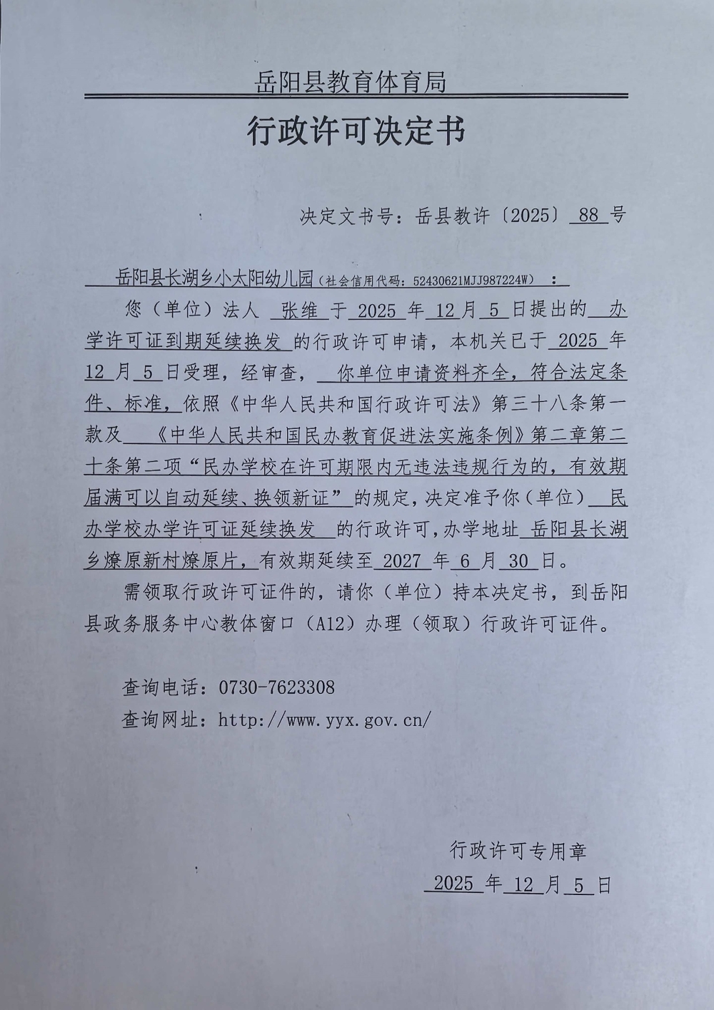 关于准予岳阳县长湖乡小太阳幼儿园办学许可证到期延续换发的许可决定