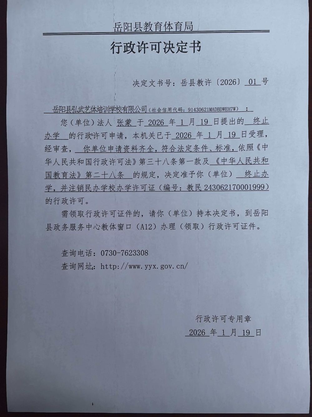 关于准予岳阳县弘武艺体培训学校有限公司办学许可证注销的许可决定