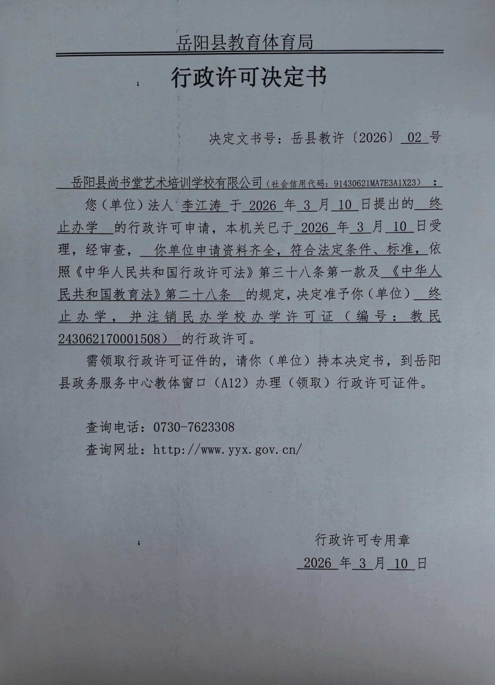 关于准予岳阳县尚书堂艺术培训学校有限公司办学许可证注销的许可决定