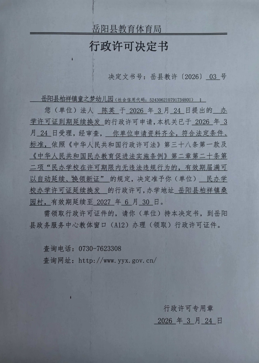 关于准予岳阳县柏祥镇童之梦幼儿园2026年办学许可证到期延续换发的许可决定