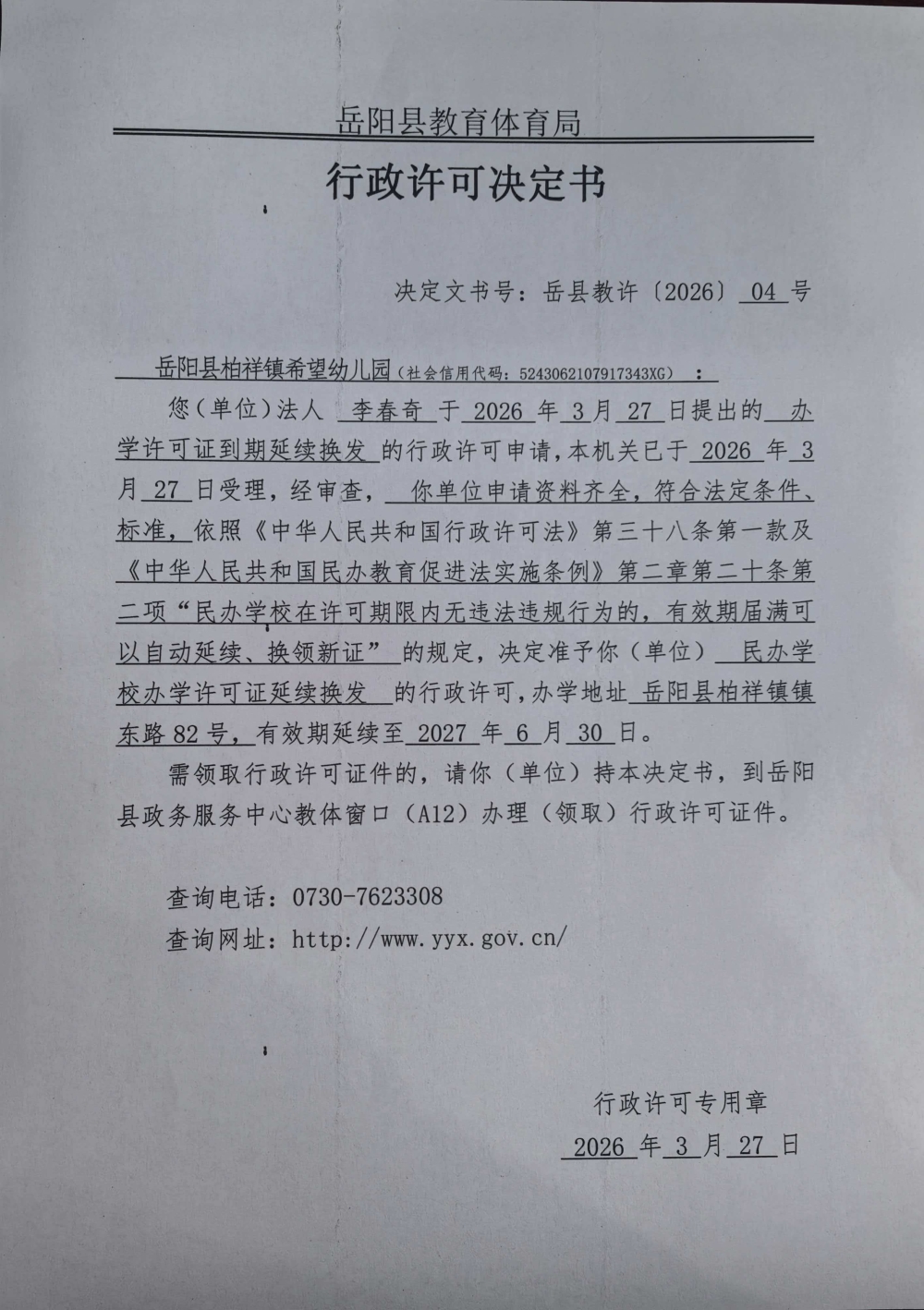 关于准予岳阳县柏祥镇希望幼儿园2026年办学许可证到期延续换发的许可决定