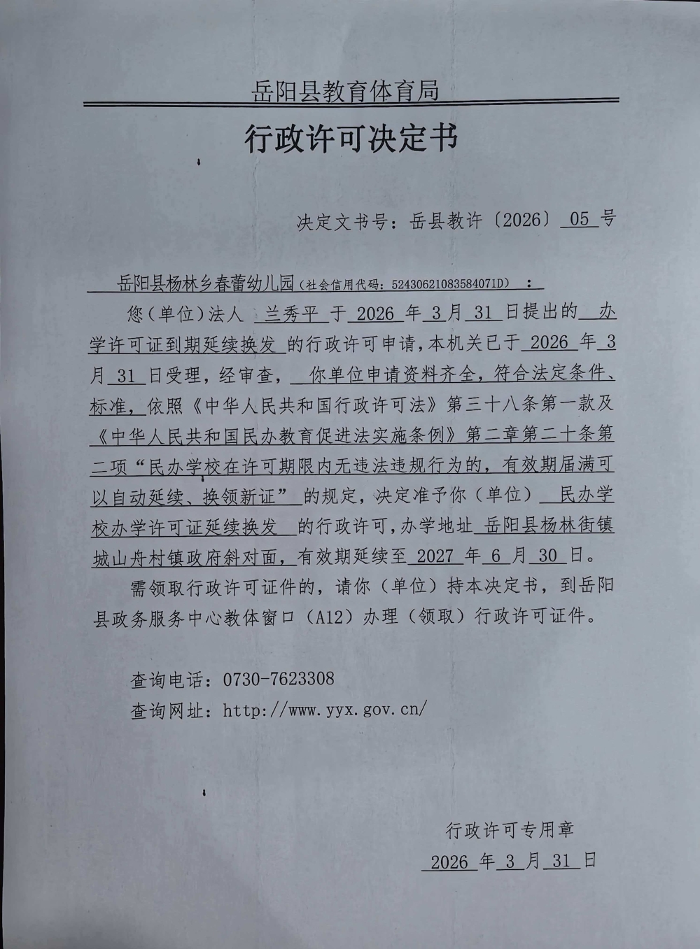 关于准予岳阳县杨林乡春蕾幼儿园办学许可证到期延续换发的许可决定
