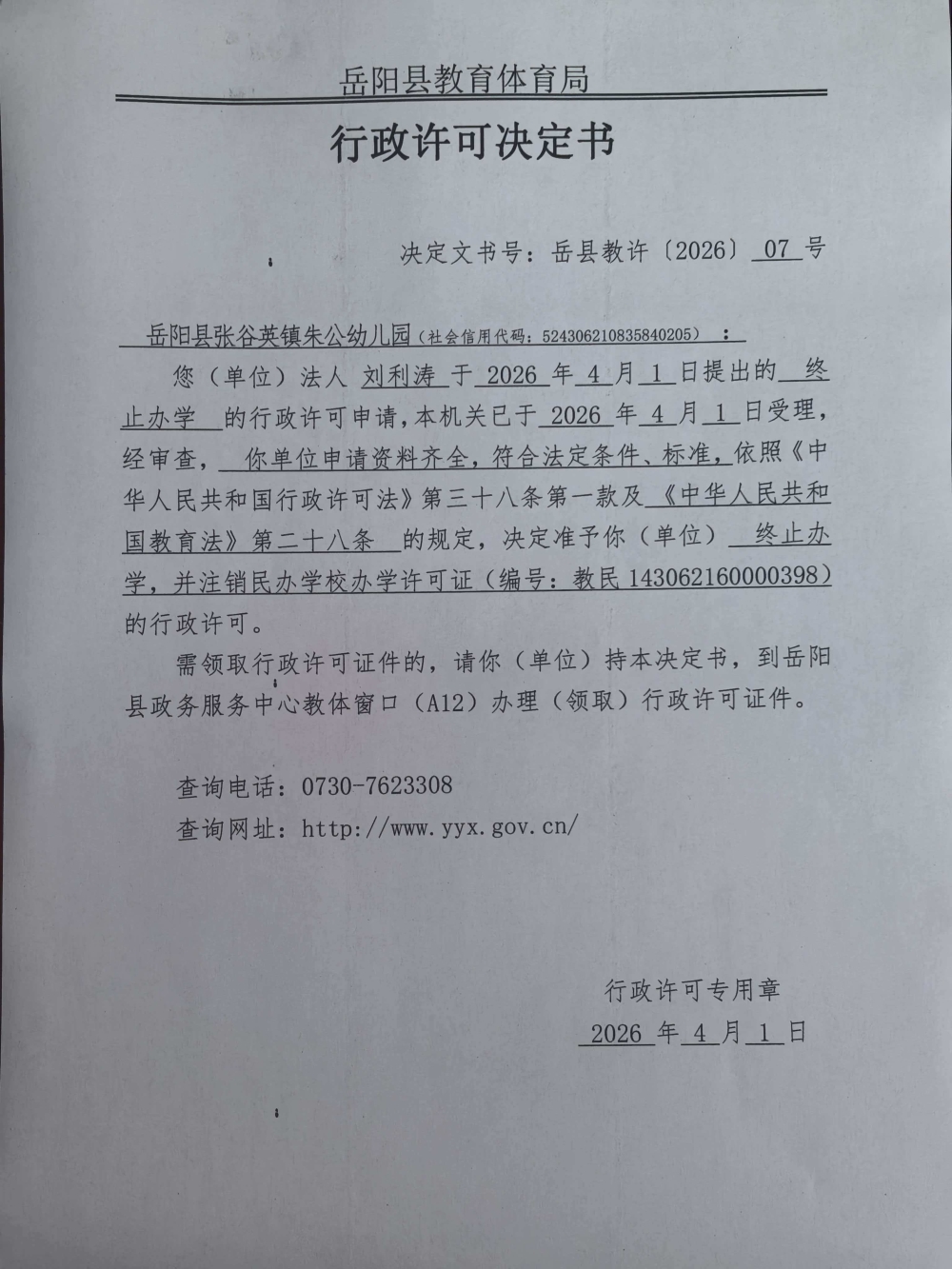 关于准予岳阳县张谷英镇朱公幼儿园办学许可证注销的许可决定