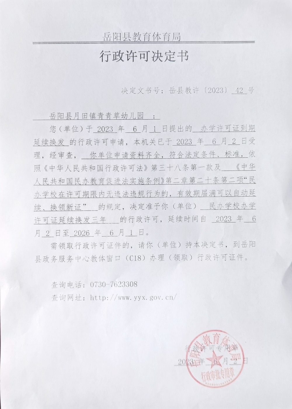 关于准予岳阳县月田镇青青草幼儿园办学许可证到期延续换发的许可决定