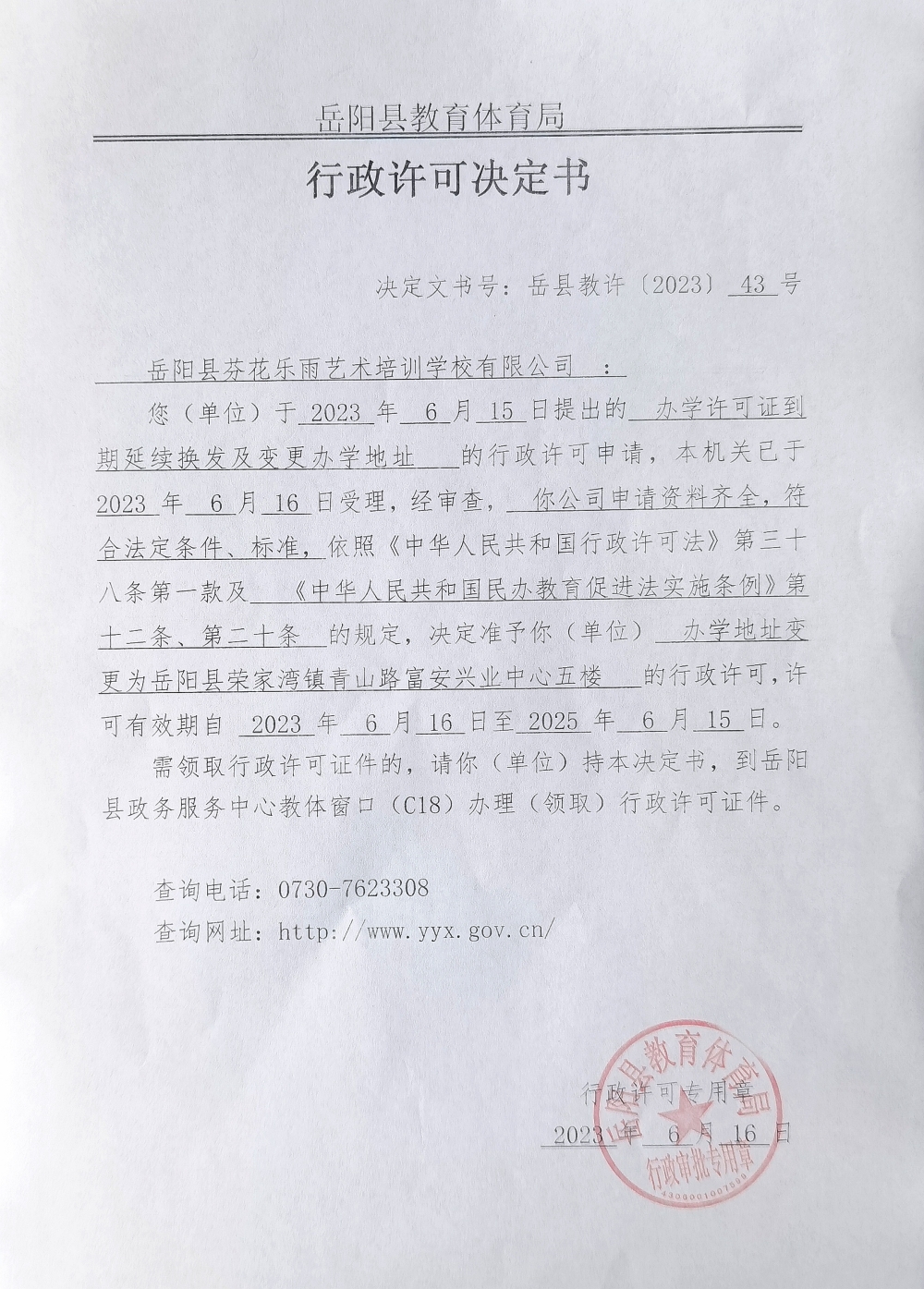 关于准予岳阳县芬花乐雨艺术培训学校有限公司办学许可证到期延续换发及变更办学地址的许可决定