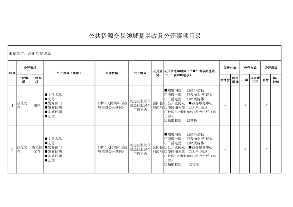 岳阳县公共资源交易领域基层政务公开事项目录