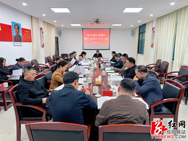 岳阳县融媒体中心11月18日讯(周昱君)11月17日,县人大常委会党组书记、主任周峰主持召开县十八届人大常委会第四十七次主任(扩大)会议,党组副书记、副主任王卫兵,副主任彭碧芳、胡秉阳、吴承棉、任三星出席,县委常委、县纪委书记、县监委主任邓旭旺列席会议。