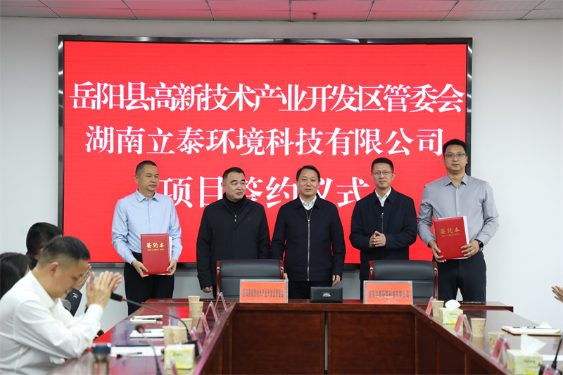 岳阳县融媒体中心12月23日讯(尹宇豪 张帆)12月22日,县高新技术产业开发区与湖南立泰环境科技有限公司举行MOFs材料规模化生产及成型应用项目签约仪式。县委副书记、县长吴光文,岳阳兴长石化股份有限公司总经理付锋,党委书记邹海波出席签约仪式。副县长刘炀主持签约仪式。