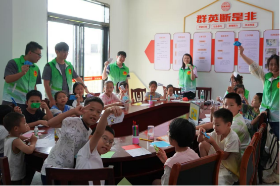 来自中南大学的志愿者们精心准备了折纸、画画、唱歌、诗歌朗诵、AI体验和知识问答等课程,内容涵盖艺术、科学、历史、文化等多个领域,孩子们积极参与,现场气氛热烈而活跃。志愿者们不仅教授孩子们各项技能知识,还通过演绎、游戏和短视频的形式,向他们普及防溺水、防性侵相关的安全教育内容。以贴近孩童的语言给孩子们分享了如何预防溺水、如何提高自我保护意识的知识。