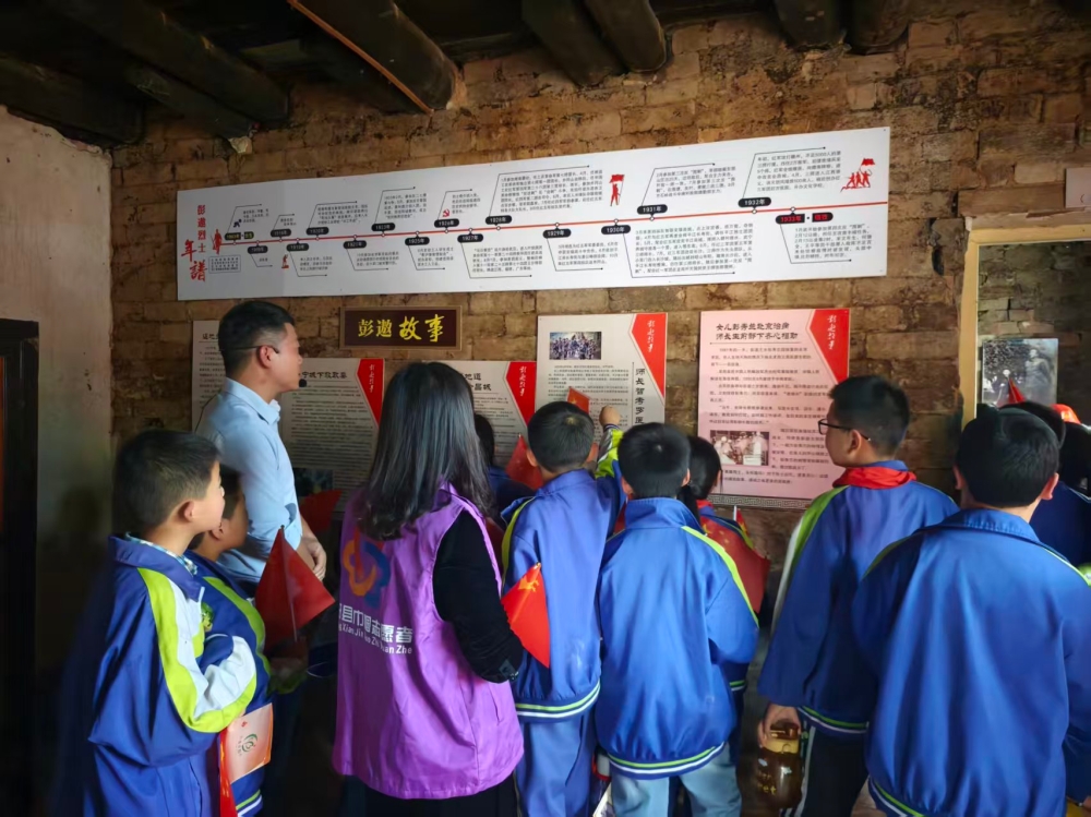 下午,活动转场至彭遨烈士旧居,开展学雷锋教育活动。50名来自步仙中心小学的学生在社工和讲解员的带领下,有序参观了烈士旧居,聆听彭遨烈士的成长故事与革命事迹,观看珍贵图片与实物展示。在“我想对先烈说”环节,学生代表分享了参观感悟,表达了对革命先烈的崇敬之情和报国之志。
