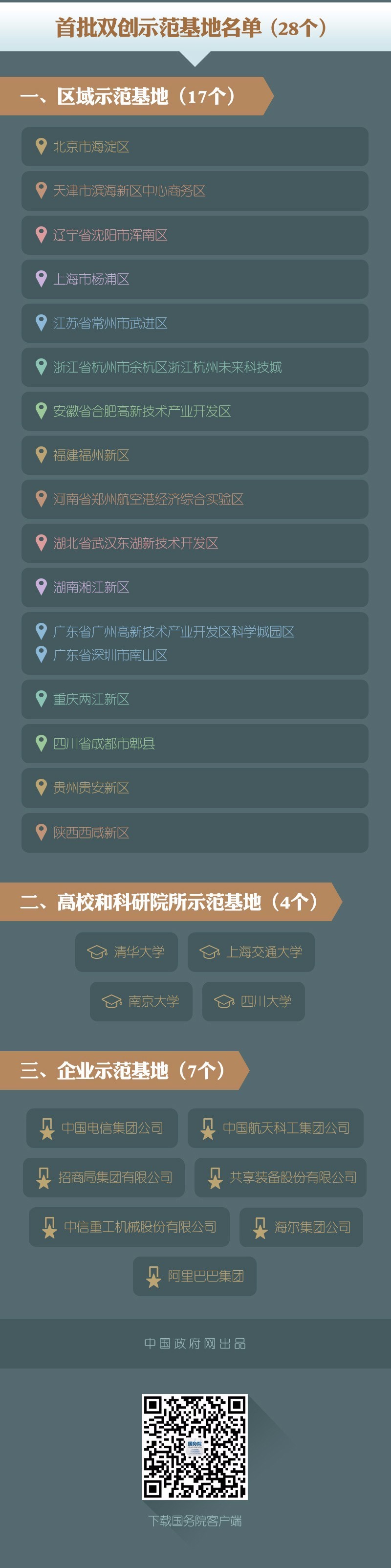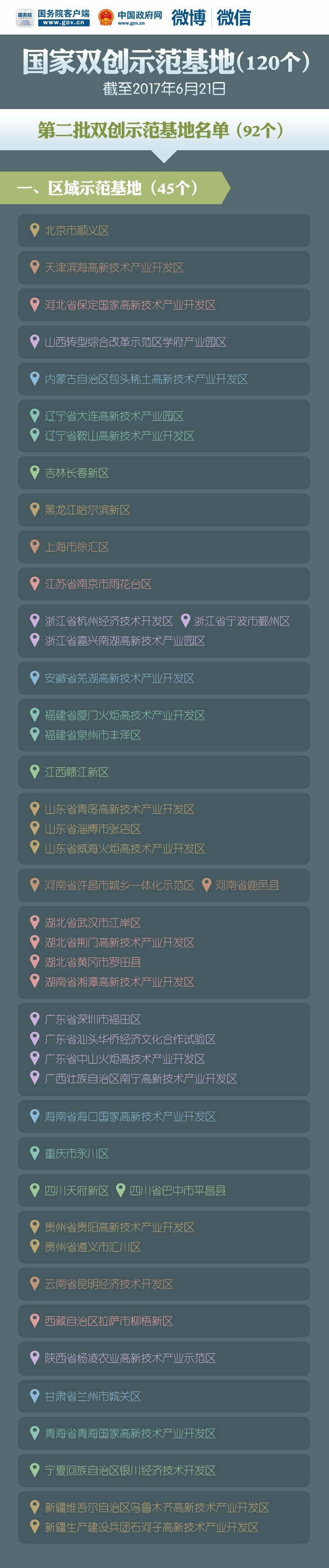 在6月7日的国务院常务会上,李克强总理指出,“这些示范基地形成了一批行之有效的双创模式和经验,有力促进了就业扩大和新动能成长。”马上,6月21日,国务院办公厅发文公布了第二批双创示范基地名单,快来跟中国政府网(微信ID:zhengfu)、国务院客户端看看离你最近的示范基地在哪吧!