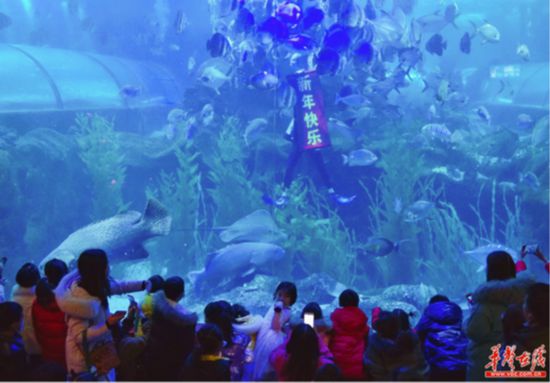 长沙海底世界潜水员与群鱼共舞送祝福资料图(湖南日报·华声在线记者 徐行 摄)