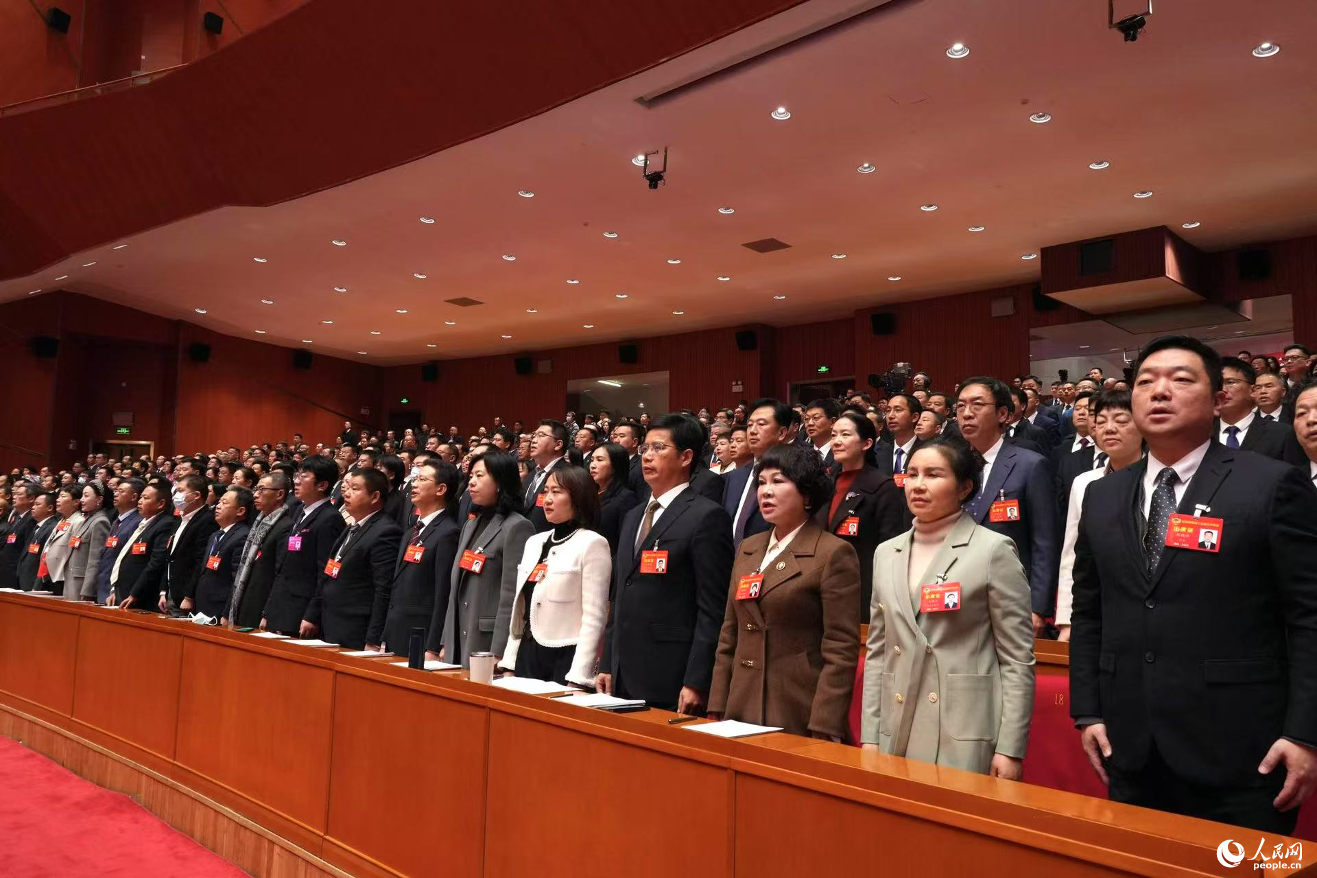 全体起立唱国歌。人民网 刘汕摄