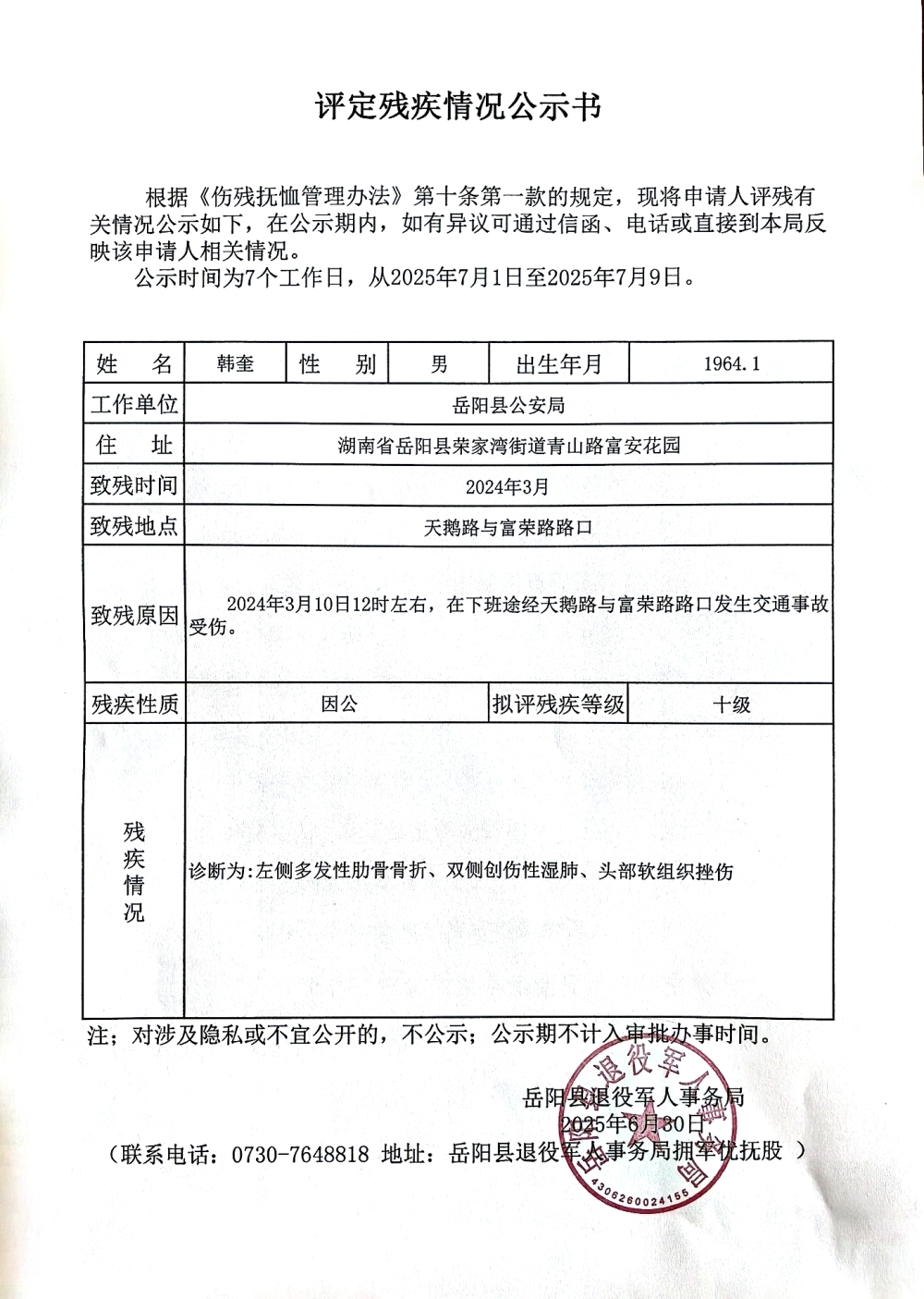岳阳县退役军人事务局评定残疾情况公示书(韩奎)