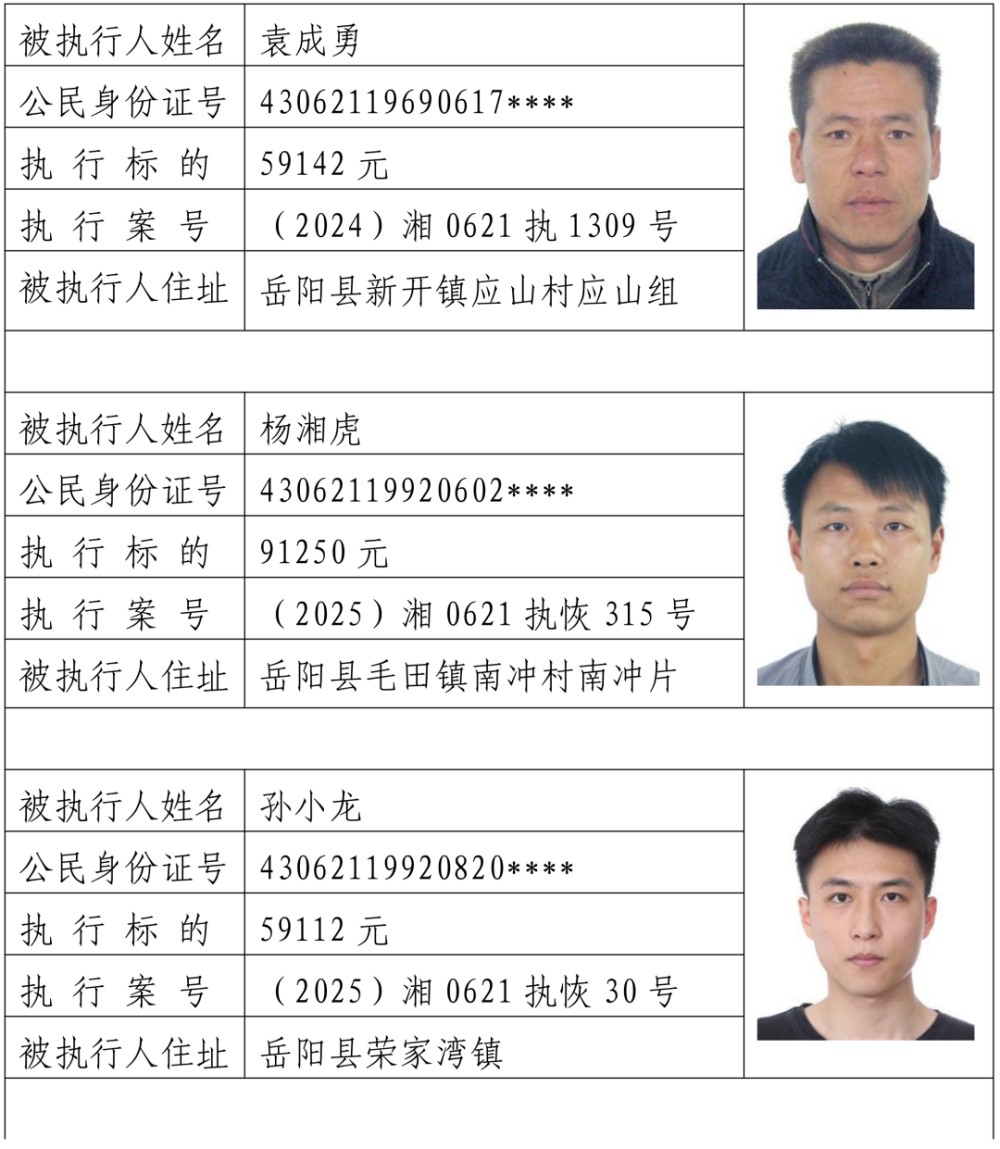 为敦促被执行人自觉履行生效法律文书确定的义务,努力推进社会诚信建设。根据《中华人民共和国民事诉讼法》《最高人民法院关于公布失信被执行人名单信息的若干规定》等相关法律和规定,本院决定对下列失信被执行人信息予以曝光。曝光人员应立即履行生效法律文书确定的义务,否则将视情节采取罚款、拘留等强制措施,对拒不履行、抗拒执行、规避执行的被执行人将依法追究刑事责任。【备注:下述失信被执行人名单信息仅代表本次曝光时段情况,实时失信被执行人信息以最高院网站查询结果为准。欢迎广大人民群众对已曝光被执行人行踪及财产线索进行举报。举报电话:0730-7668833。】