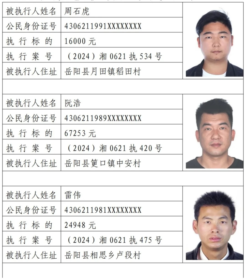 为敦促被执行人自觉履行生效法律文书确定的义务,努力推进社会诚信建设。根据《中华人民共和国民事诉讼法》《最高人民法院关于公布失信被执行人名单信息的若干规定》等相关法律和规定,本院决定对下列失信被执行人信息予以曝光。曝光人员应立即履行生效法律文书确定的义务,否则将视情节采取罚款、拘留等强制措施,对拒不履行、抗拒执行、规避执行的被执行人将依法追究刑事责任。【备注:下述失信被执行人名单信息仅代表本次曝光时段情况,实时失信被执行人信息以最高院网站查询结果为准。欢迎广大人民群众对已曝光被执行人行踪及财产线索进行举报。举报电话:0730-7668833。】