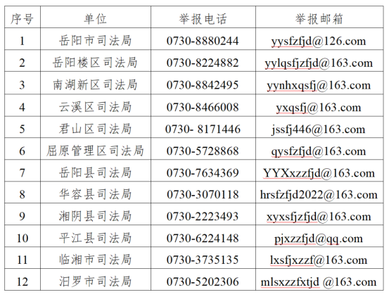 1.市司法局和各县(市区)司法局举报邮箱、举报电话。
