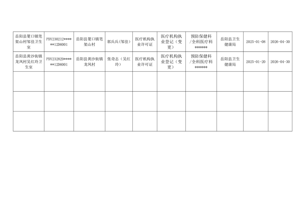 岳阳县卫生健康局2025年1月医疗机构执业许可公示