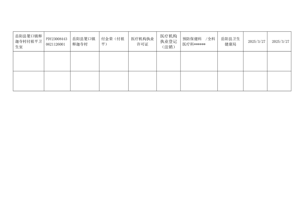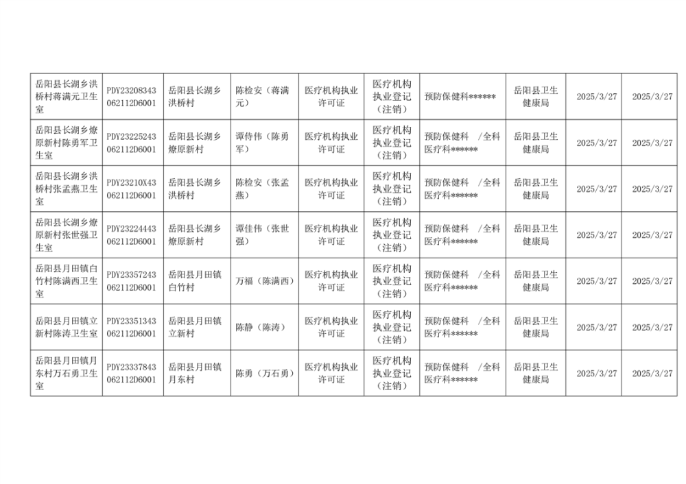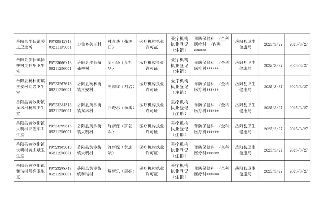 岳阳县卫生健康局2025年3月医疗机构执业许可公示