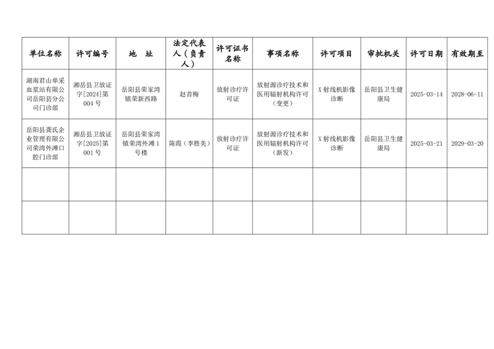 岳阳县卫生健康局2025年第一批放射诊疗许可公示