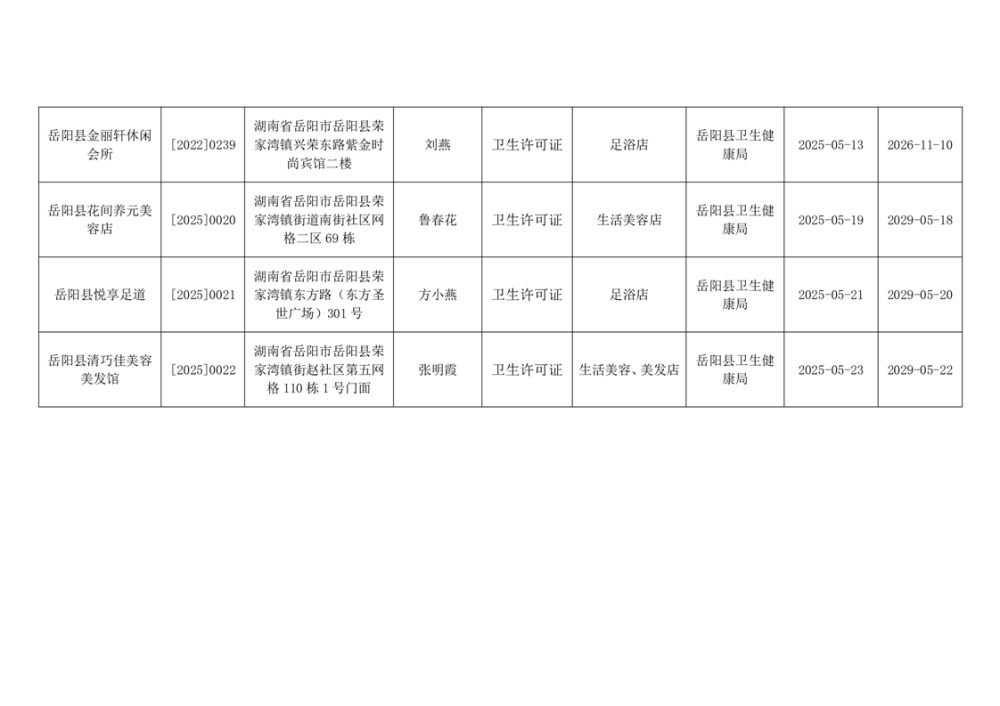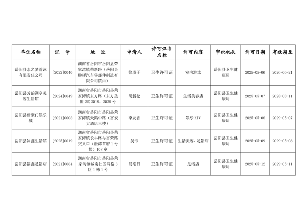 岳阳县卫生健康局2025年5月卫生许可公示