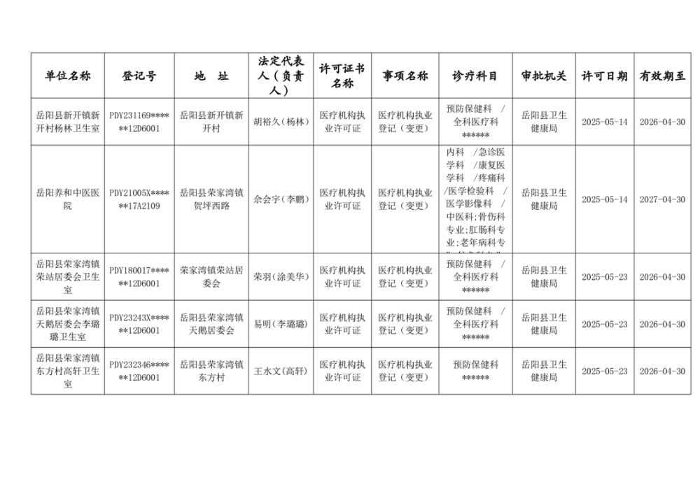 岳阳县卫生健康局2025年5月医疗机构执业许可公示