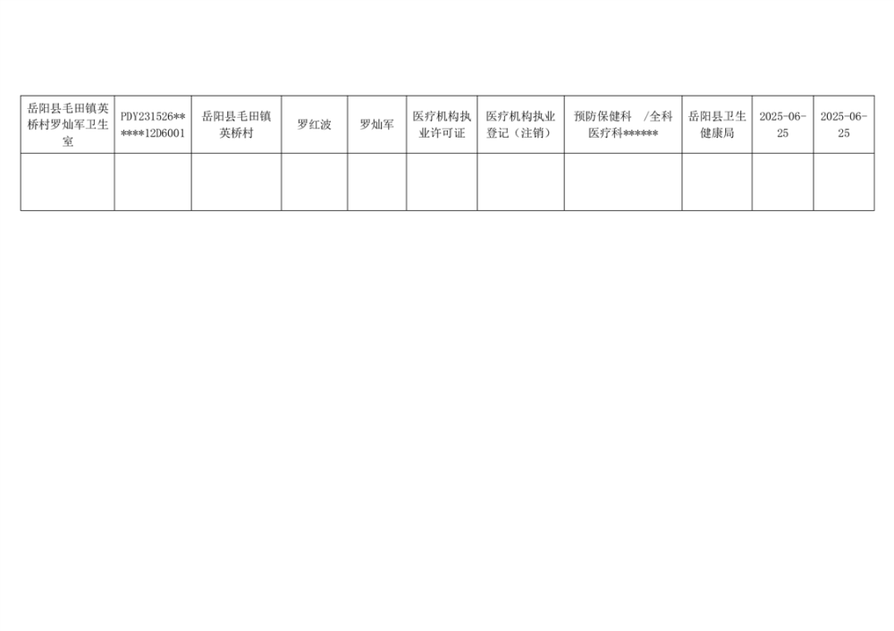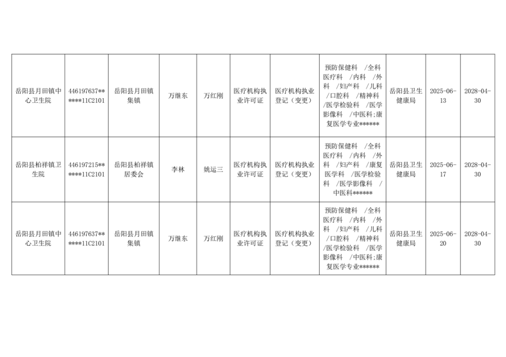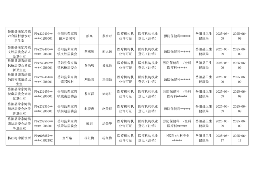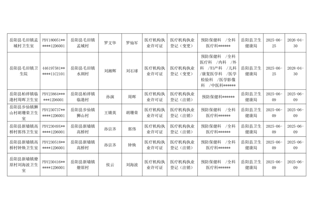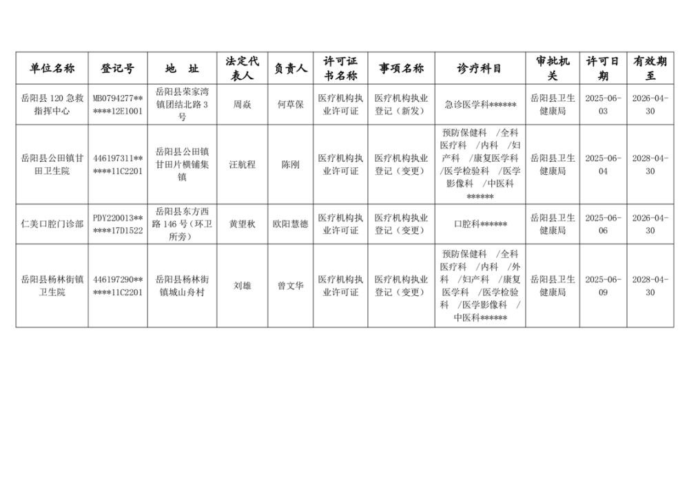 岳阳县卫生健康局2025年6月医疗机构执业许可公示
