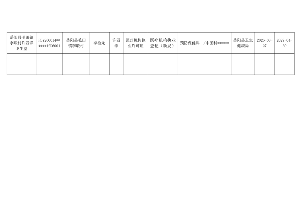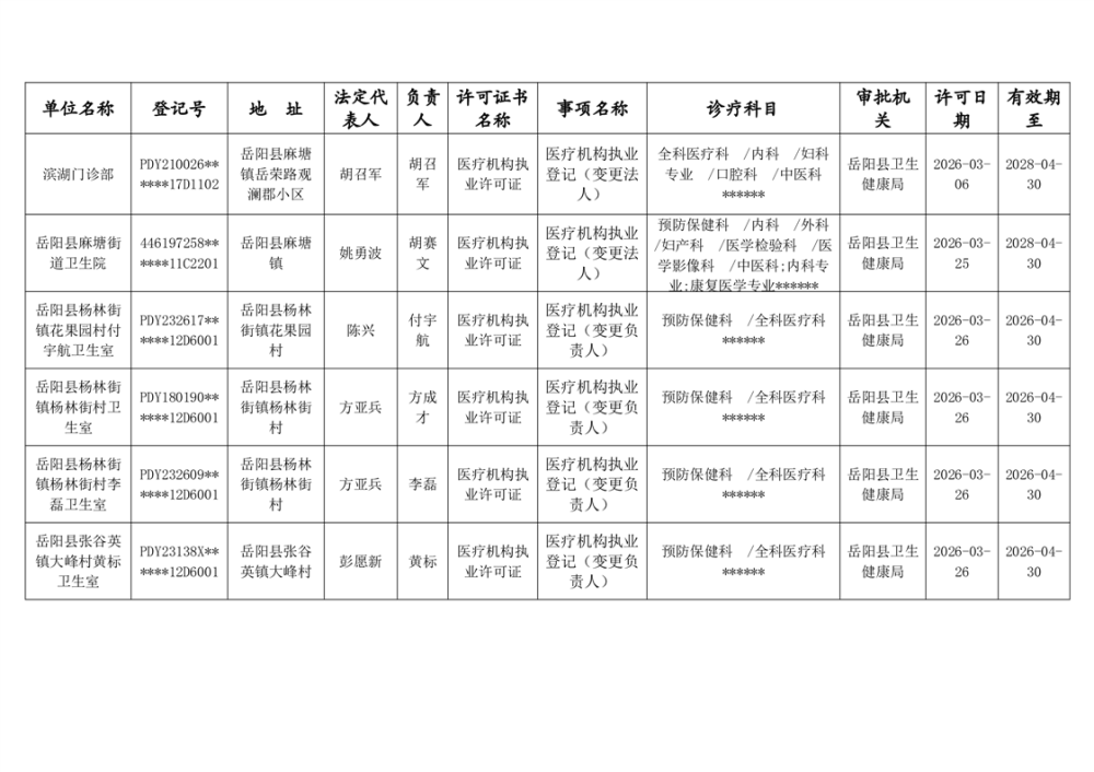 岳阳县卫生健康局2026年3月医疗机构执业许可公示
