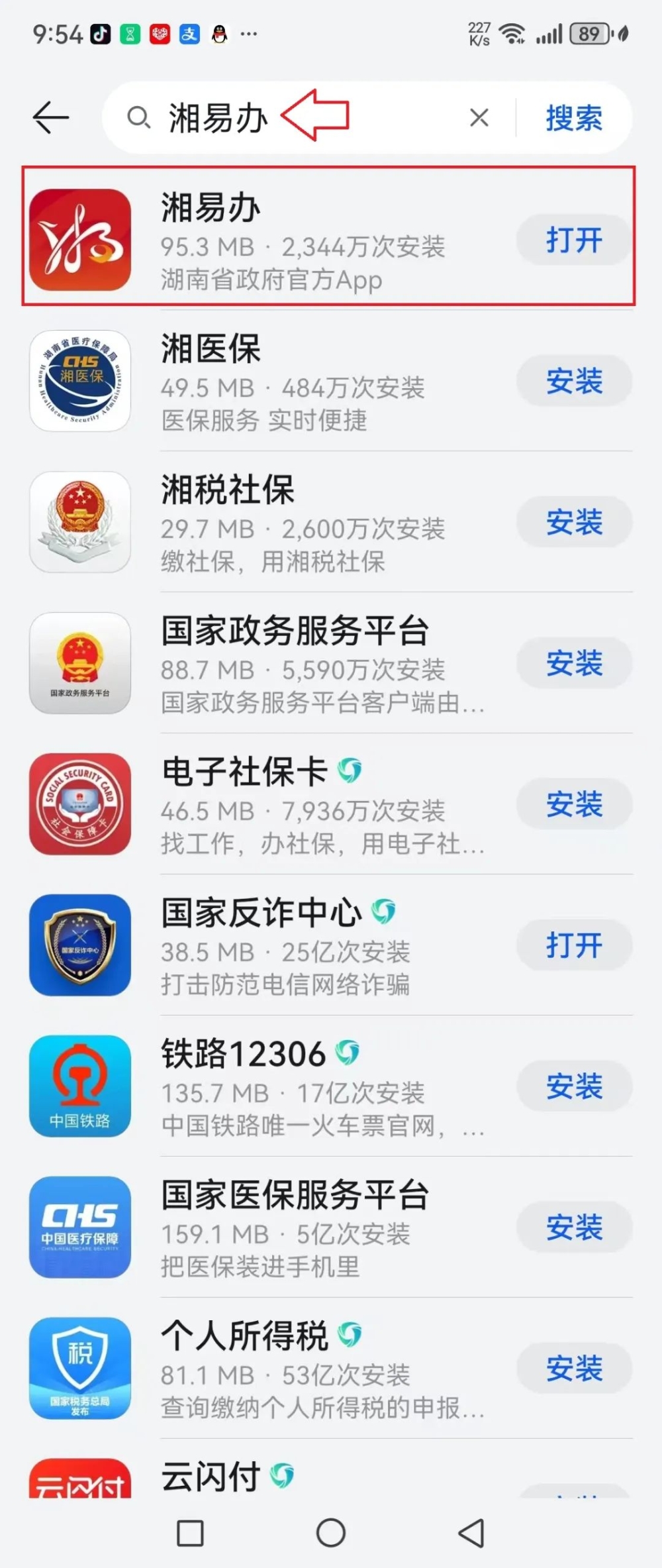进入手机“应用市场”→输入“湘易办”→点击“安装”“打开”