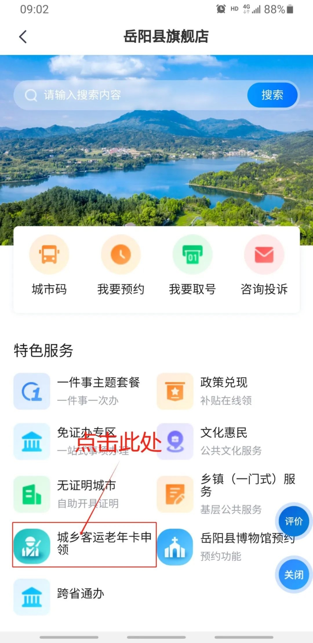 进入“岳阳市”界面后,向下滑动,在区县频道中找到“岳阳县”点击进入→在“岳阳县旗舰店”点击”城乡客运老年卡申领”