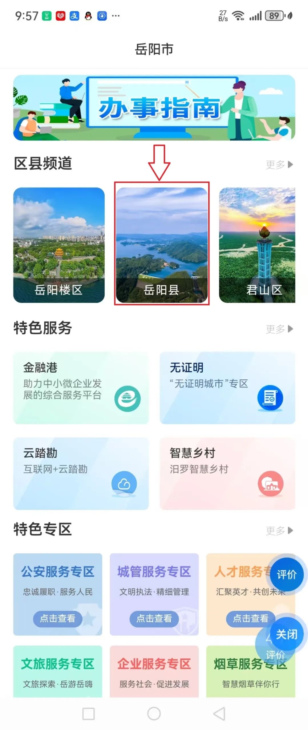 进入APP界面后,向下滑动,点击“市州专区”→选择岳阳市→点击”前往”