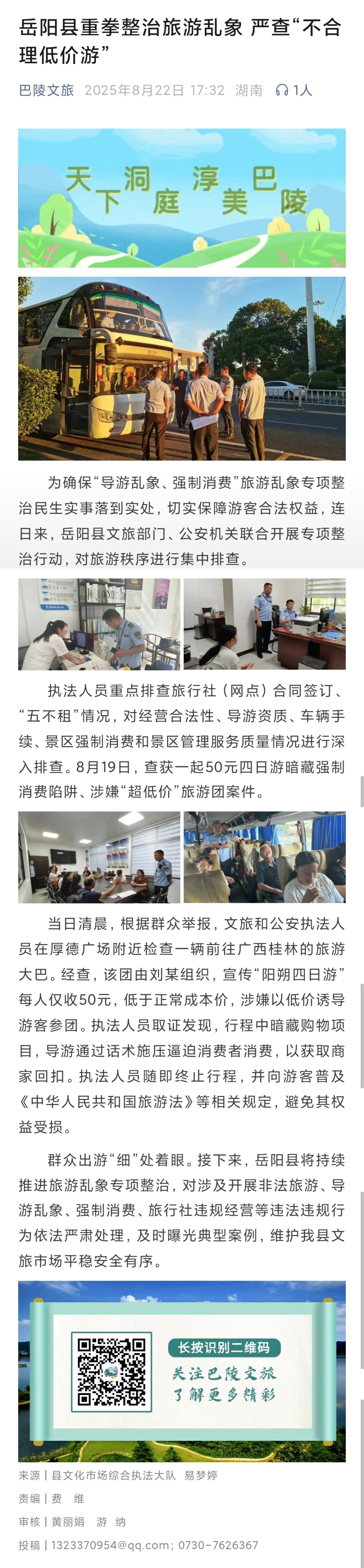 岳阳县重拳整治旅游乱象 严查“不合理低价游”