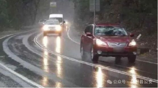 3、在湿滑路面行车,请降低车速行驶,保持与前车的安全车距,遇情况提前采取制动、减速措施,避免紧急制动、紧急转向,以防车辆侧滑发生危险。