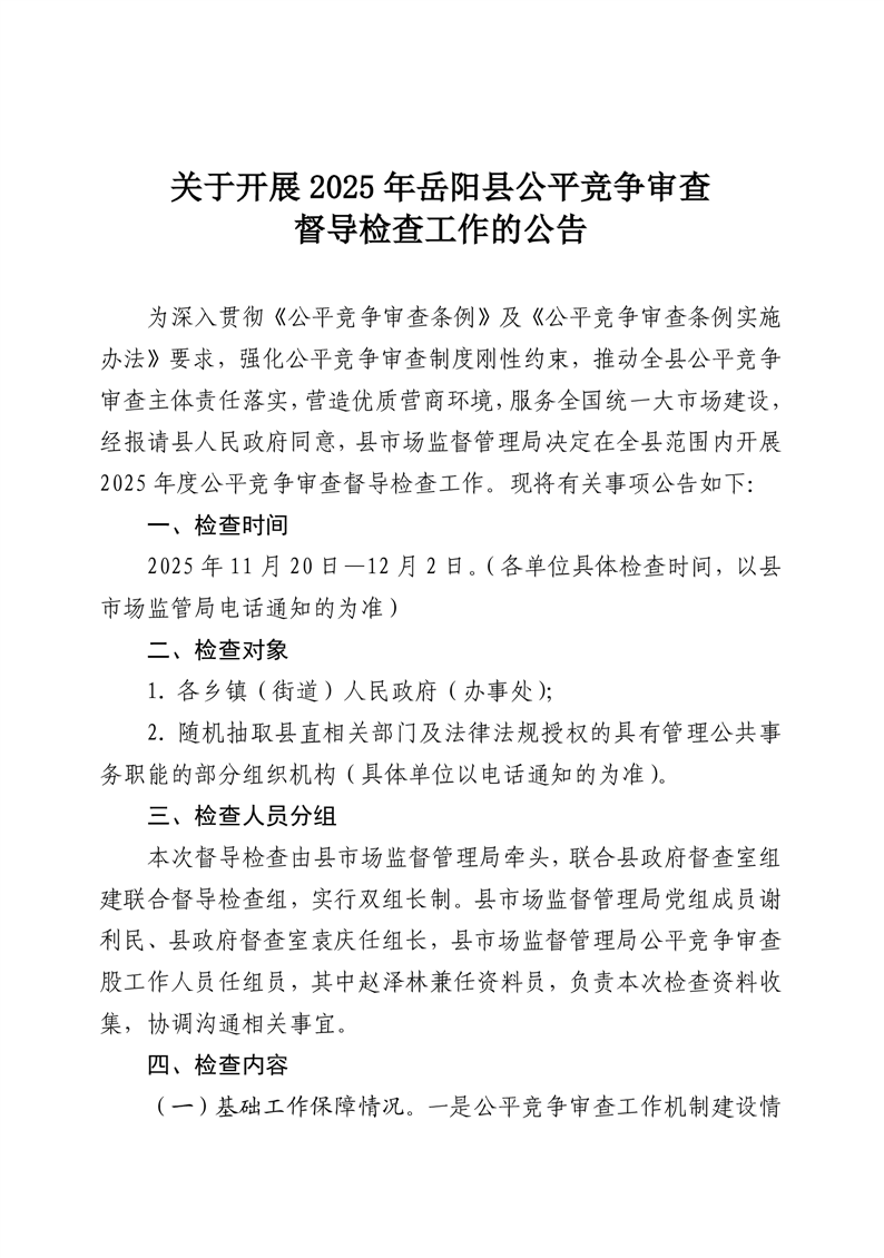 关于开展2025年岳阳县公平竞争审查督导检查的公告