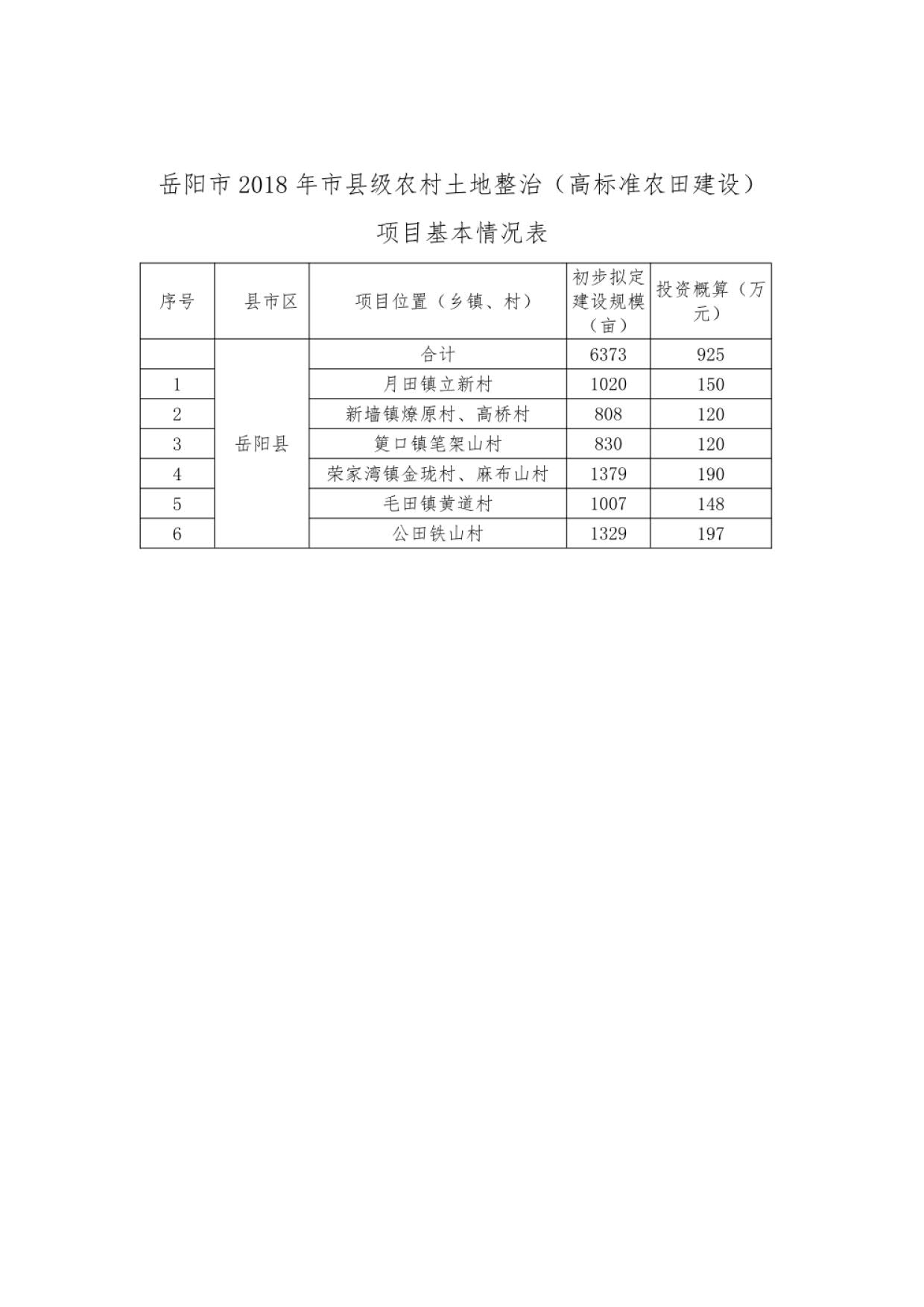 岳阳县国土资源局、财政局2018年市县级农村土地整治(高标准农田建设)项目评审结果公示