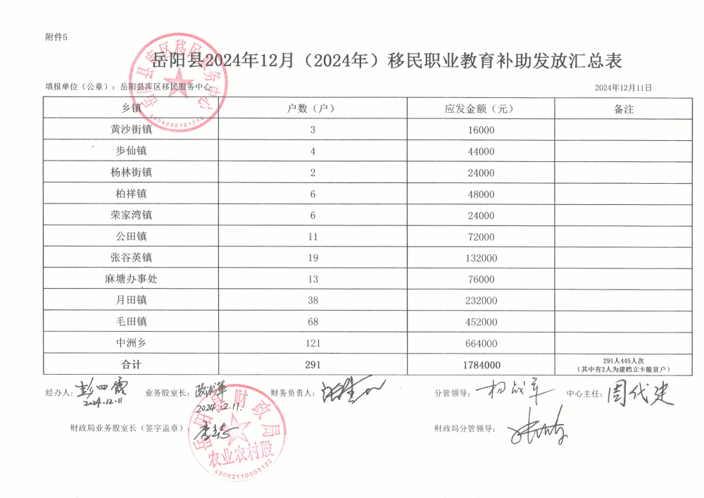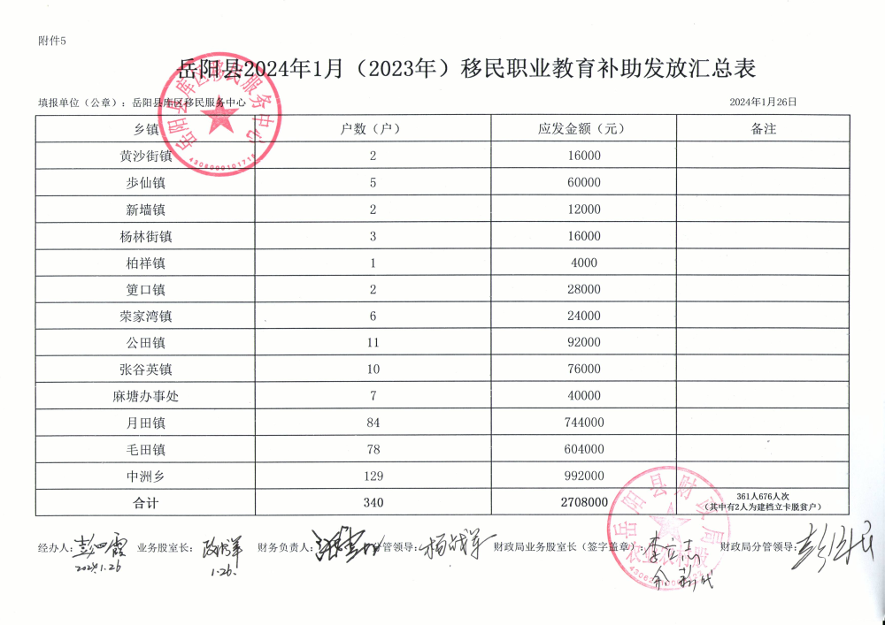岳阳县2024年移民职业教育补助发放汇总表