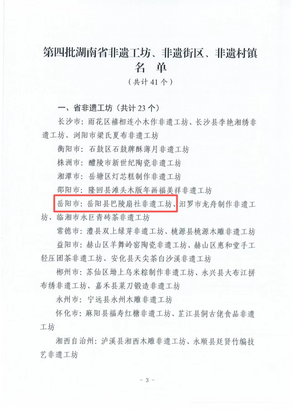 近日,湖南省文化和旅游厅正式印发《关于公布第四批湖南省非遗工坊、非遗街区、非遗村镇名单的通知》(湘文旅非遗〔2026〕4号),经专家评审、现场考察、社会公示等多道严格程序,岳阳县巴陵扇社非遗工坊成功获评第四批湖南省非遗工坊。