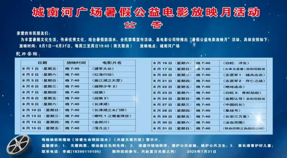 每晚映前将播放《珍爱生命预防溺水》《共建无毒巴陵》警示片。