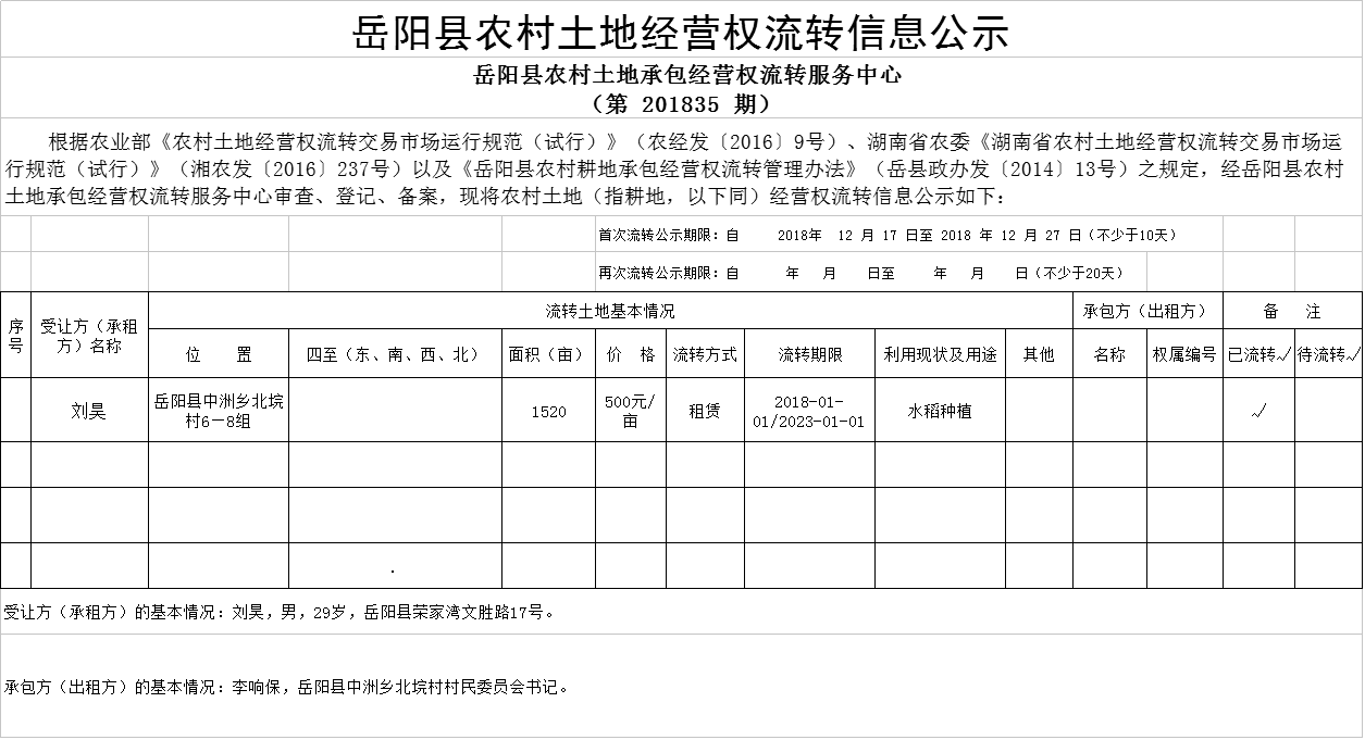 岳阳县农村土地经营权流转信息公示(第 201835 期)