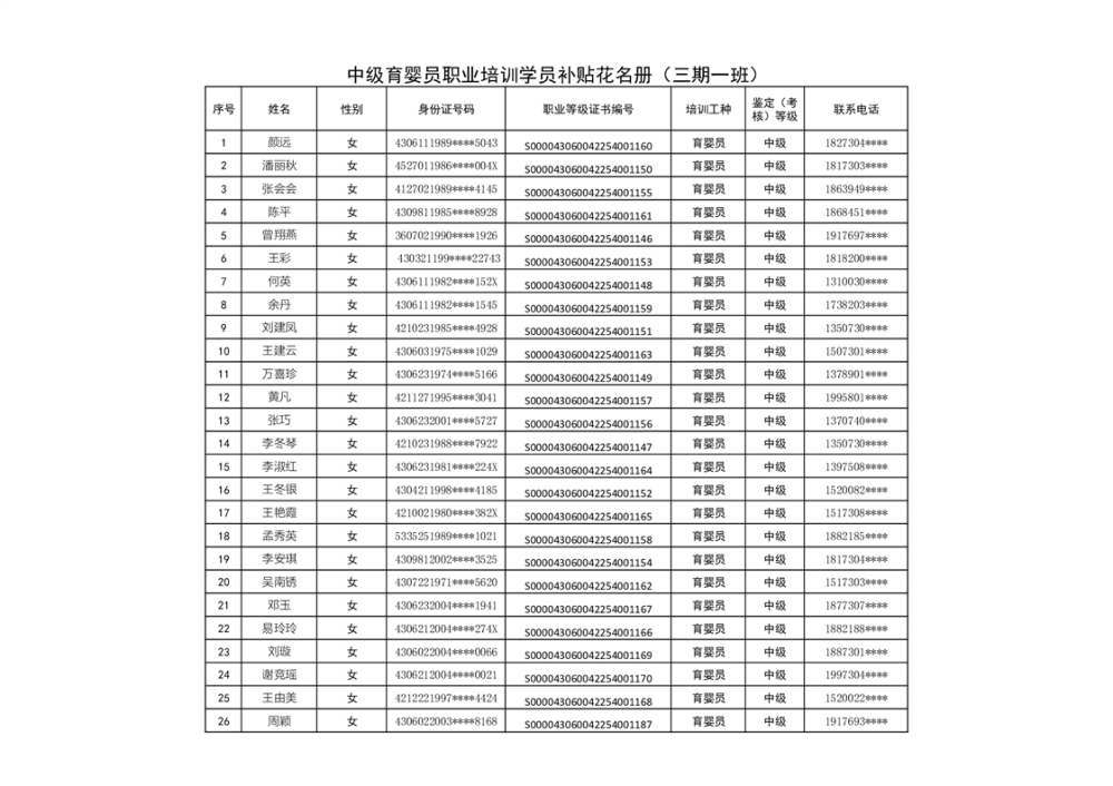 中级育婴员职业培训学员补贴花名册(三期一班)