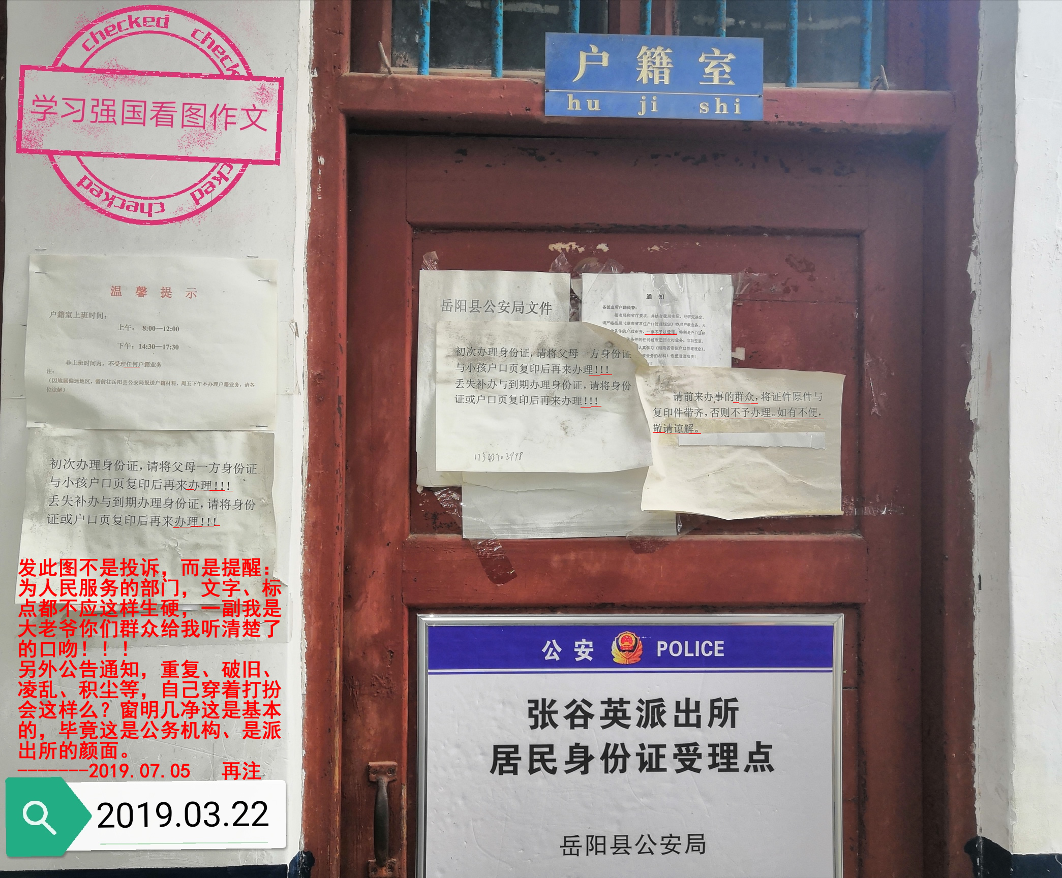 致:岳阳县公安局(张谷英派出所): 3月22日提交的图片,不是投诉业务没及时办理,我当时经村委员解释,已经接受当天下午办不成事的原因,无异议。发这图是建议张谷英派出所,把通知上的语气改改,为人民服务,这是党的宗旨,服务就真的要温馨,而不是抬头一个温馨提示,内容全市三个连续的感叹号,或者用,否则,一律,不予,言不由衷的敬请谅解等,简而言之,态度好点,而不是字里行间流露出高人一等大老爷的口气,也不要垮着一张脸好像是给来办事人莫大恩赐一样,县一级和市一级的政务服务中心或公安局窗口,都是微笑服务,能感受到真诚,派出所是基层一线,更接近老百姓,请不要用生硬冰冷的文字或语气。另外卫生不要说没有保洁阿姨,窗明几净是最基本的,更不用说蜘蛛网了,一屋不扫谈什么为人民服务,别说忙没时间,收拾自己穿着化妆打扮有时间么?我是张谷英镇的人,我并不是要找茬,只是想帮助改进提升,张谷英是旅游景点,本地和外地人和派出所打交道的都不少,别一副萧条败落的情景,即使要搬迁新办公地,在搬迁之前,也请继续做好搬迁之前的事,这是工作场所,更是党和政府机构联系一线群众的窗口,不说要豪华,至少要温馨和干净。----2019.07.05,再次反馈,以示建议。 附件1:张谷英派出所.jpg |